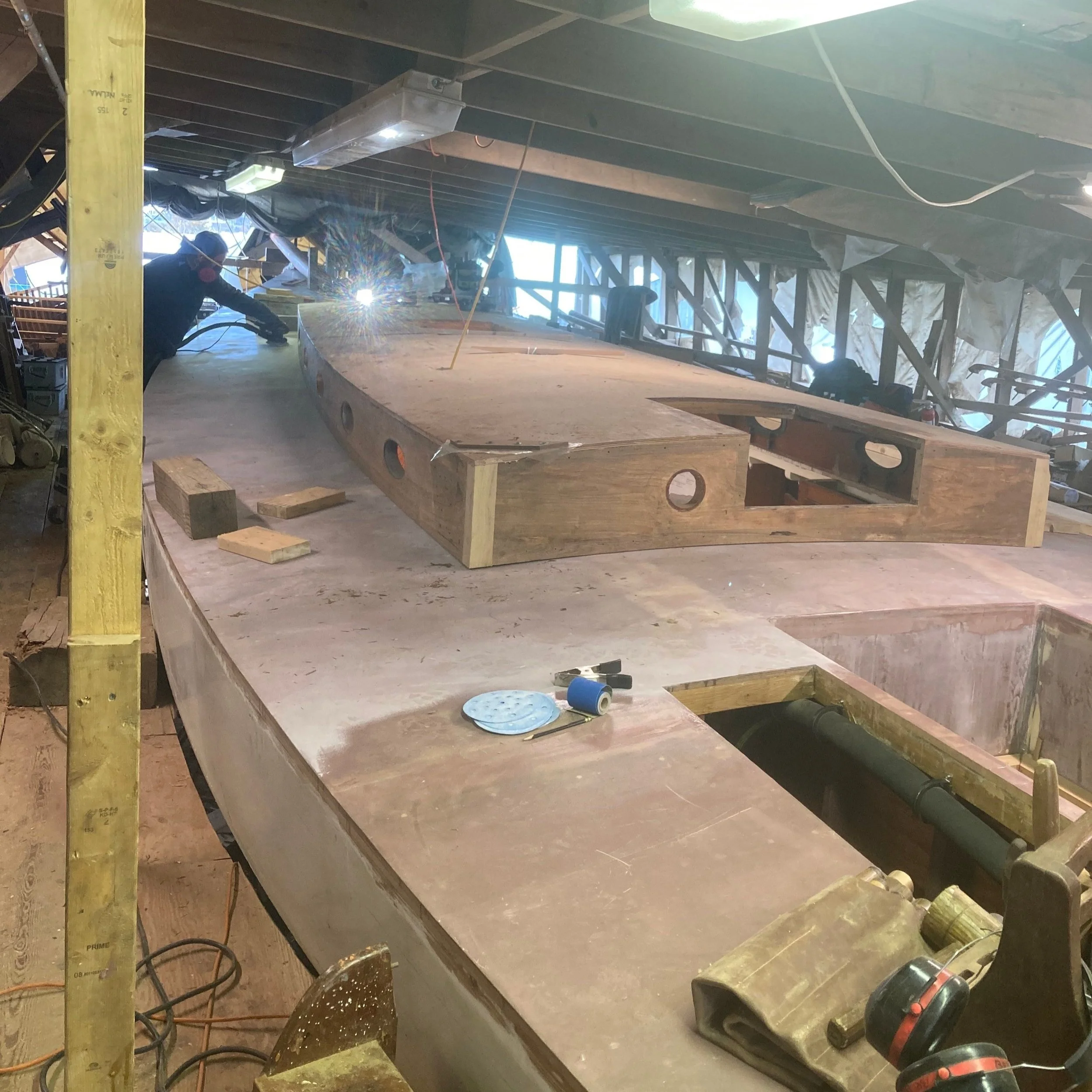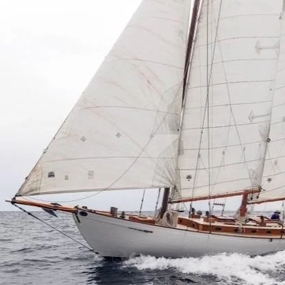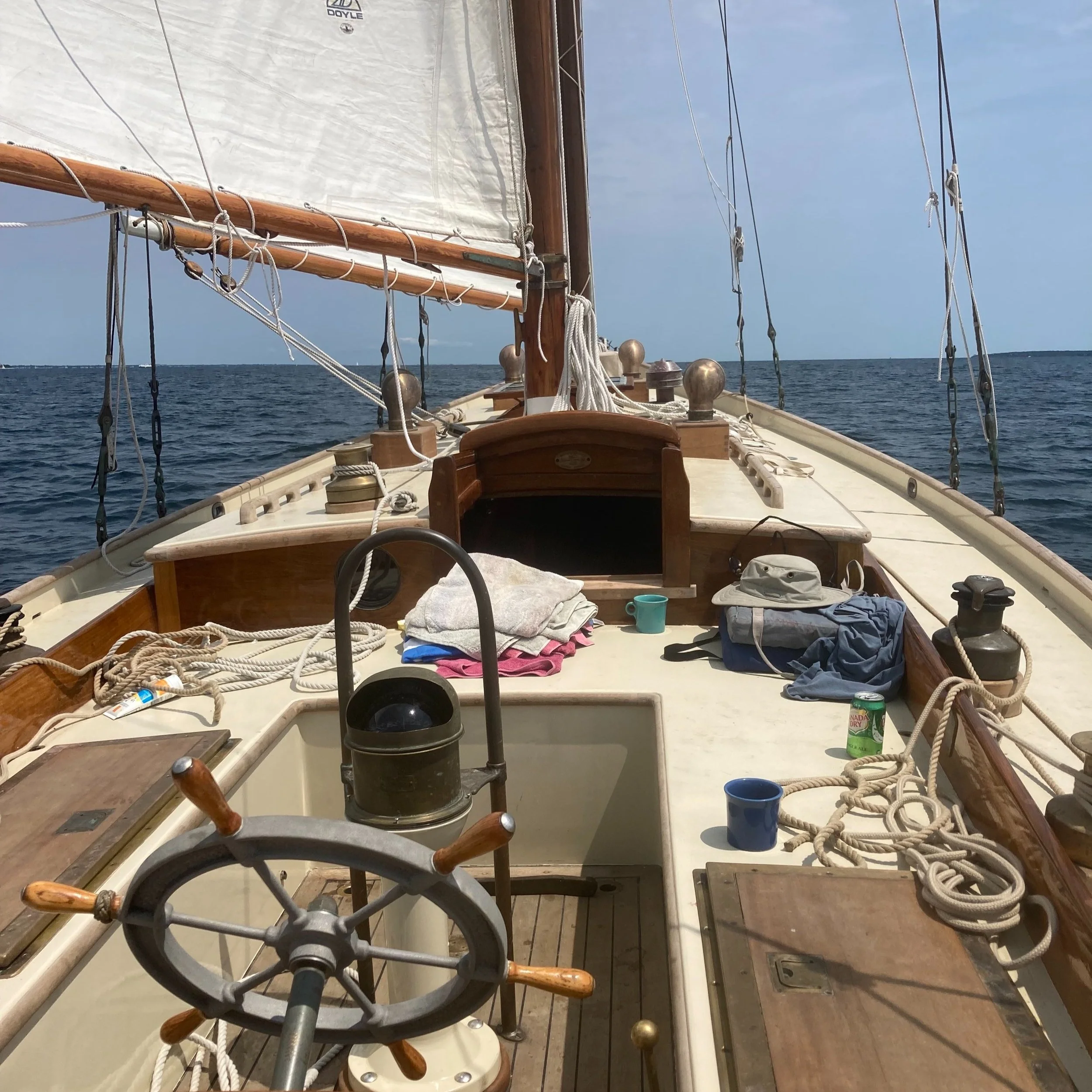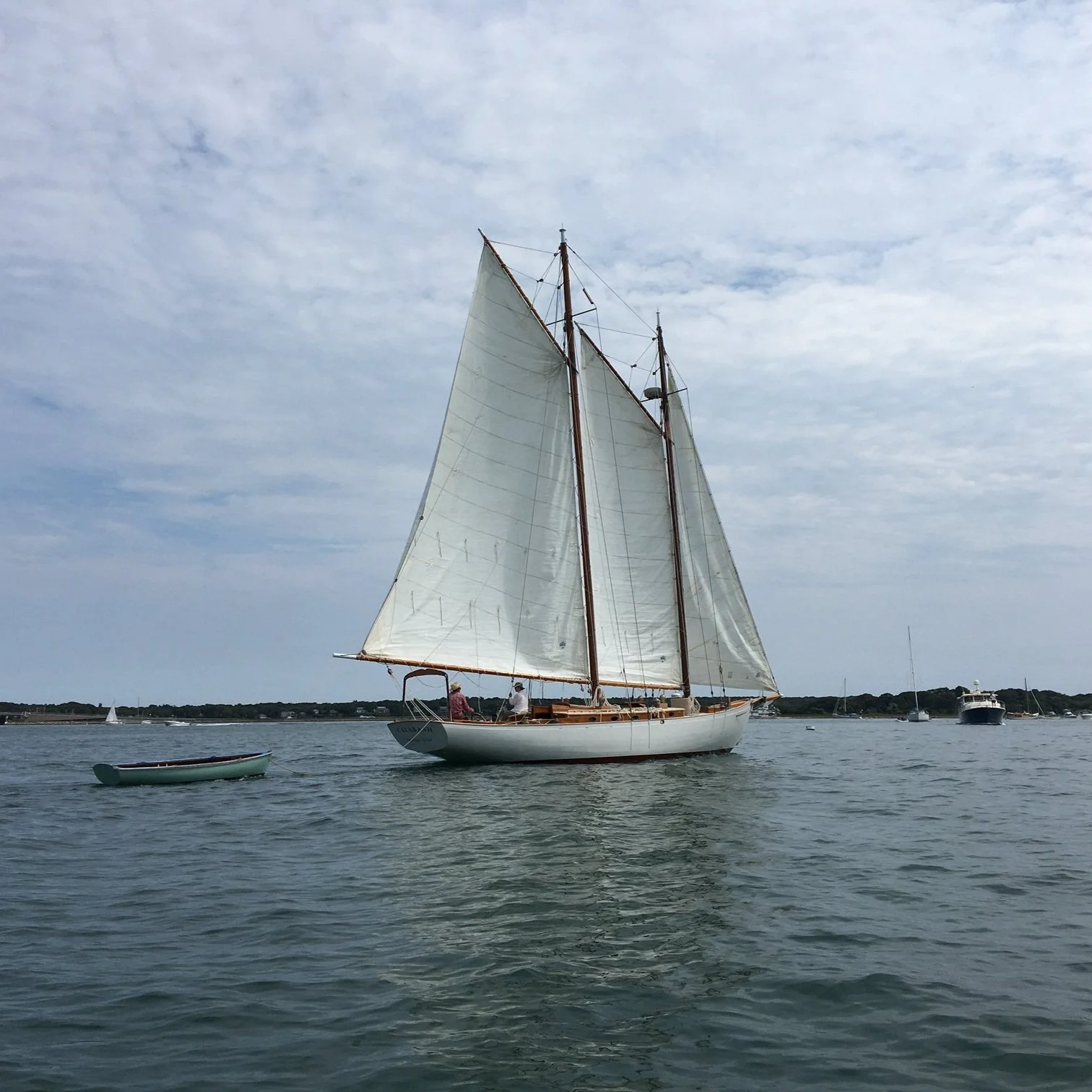 Built in 1988 as LANA AND HARLEY, CALABASH is a 44-foot gaff-rigged schooner constructed at G&B and is Nat Benjamin's first Schooner design. After spending 25 years in Bermuda she was overdue for some attention. The boat was brought back to Vineyard Haven for a complete refit. The restoration included rebuilding the deck, addressing structural issues, and upgrading the plumbing and electrical systems. Much of the boat remains the same while new features like an electric windlass were added. With a restored rig and masts, CALABASH has returned to the water as a fully revitalized classic.