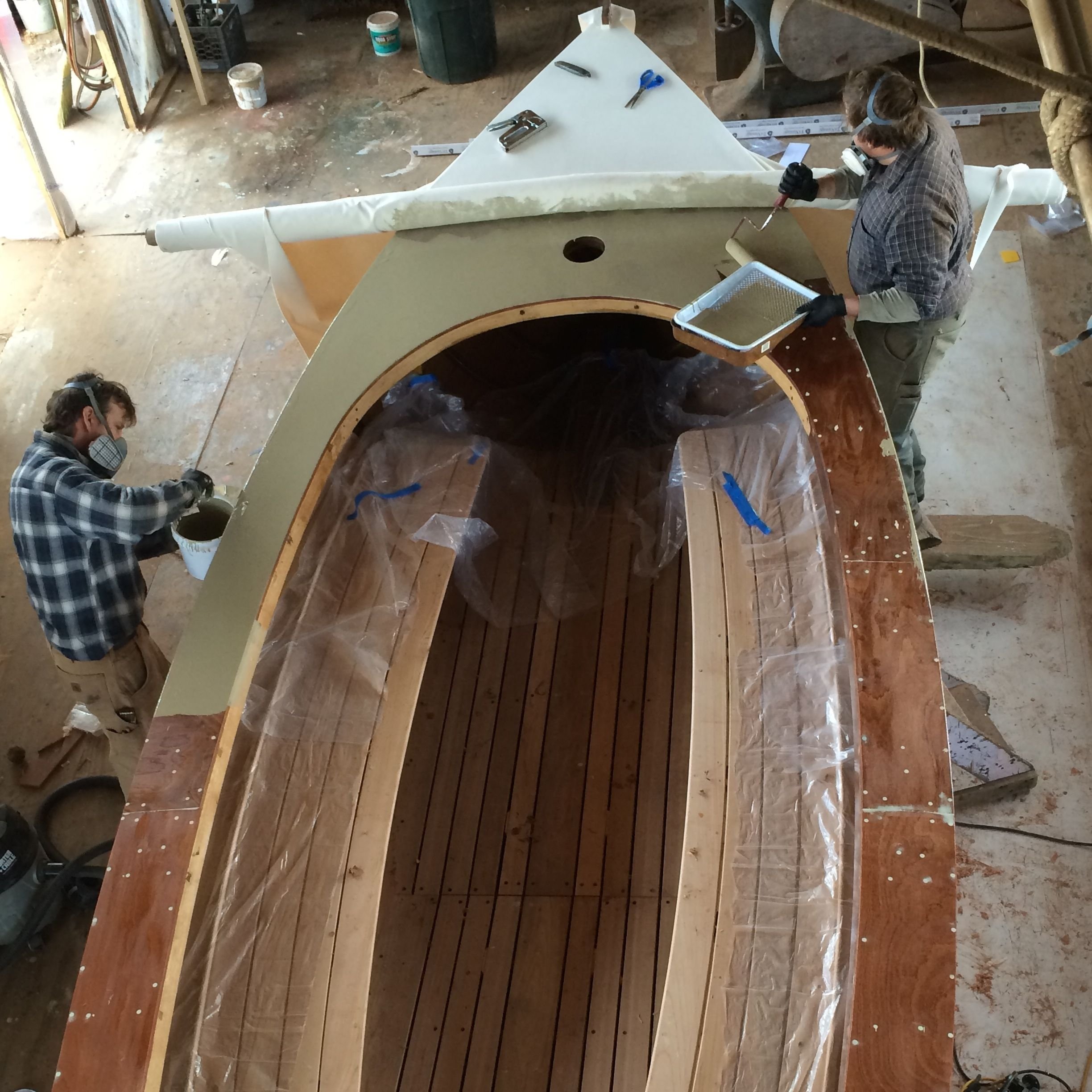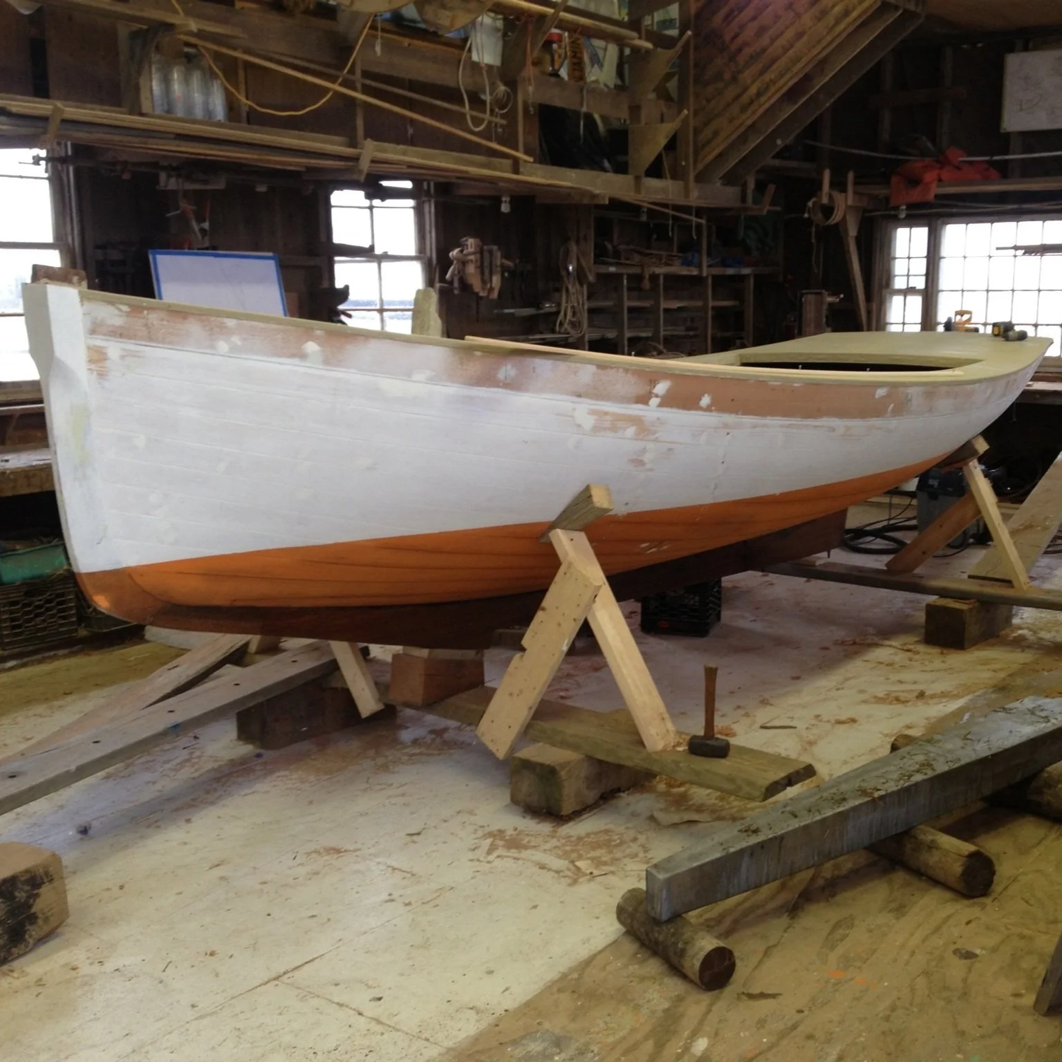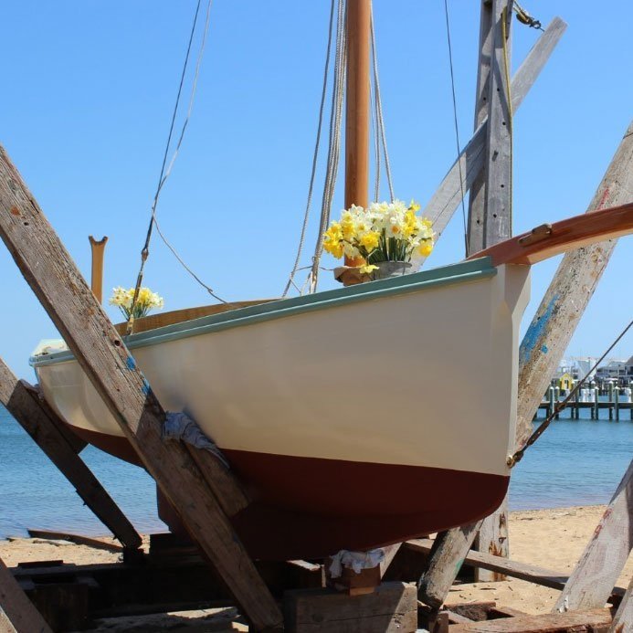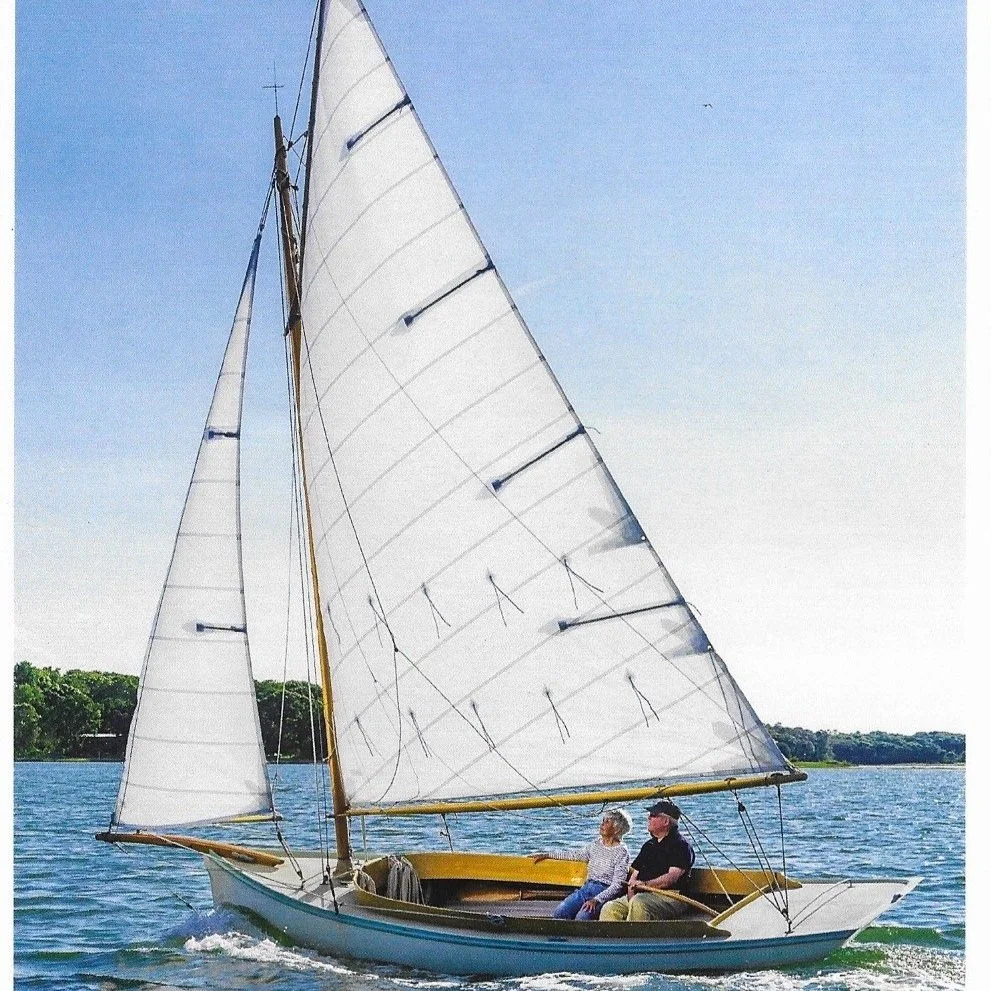 The 19’ SHELDRAKE is a downsize of Nat’s design No.1, the 25’ Canvasback. With similar plumb stem, counter stern, but with a less sail area and no centerboard, she is easy to single-hand and quick around the buoys. Six or eight adults can rip around the bay or lounge in her wide open cockpit. Informal sailing at its best.
